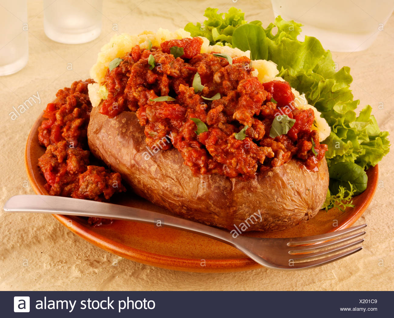 Baked Potato With Bolognese Sauce And Basil Stock Photo Alamy