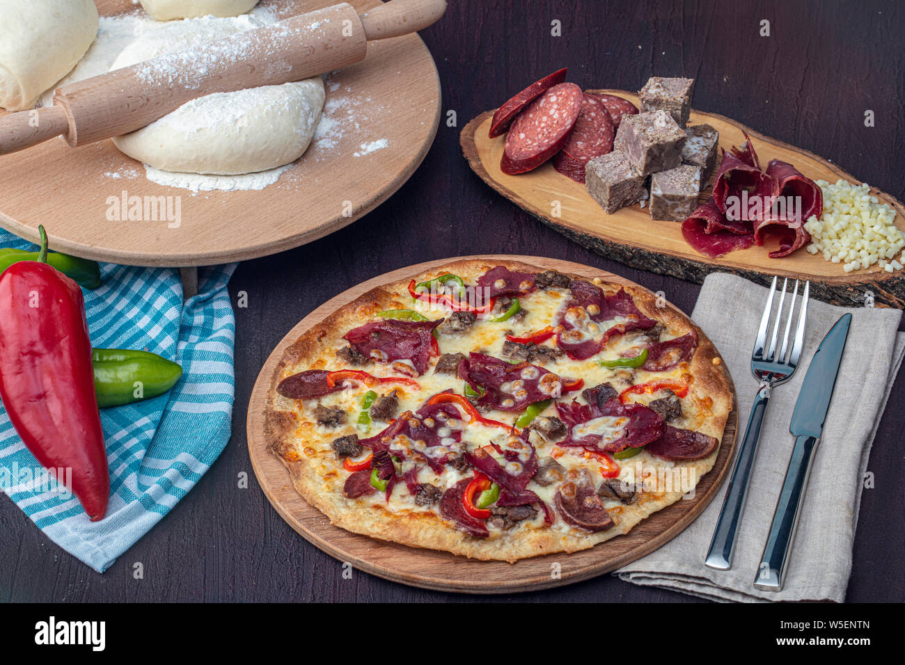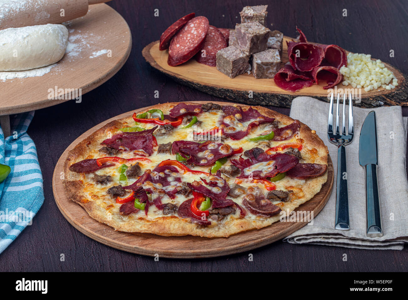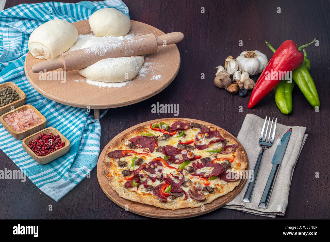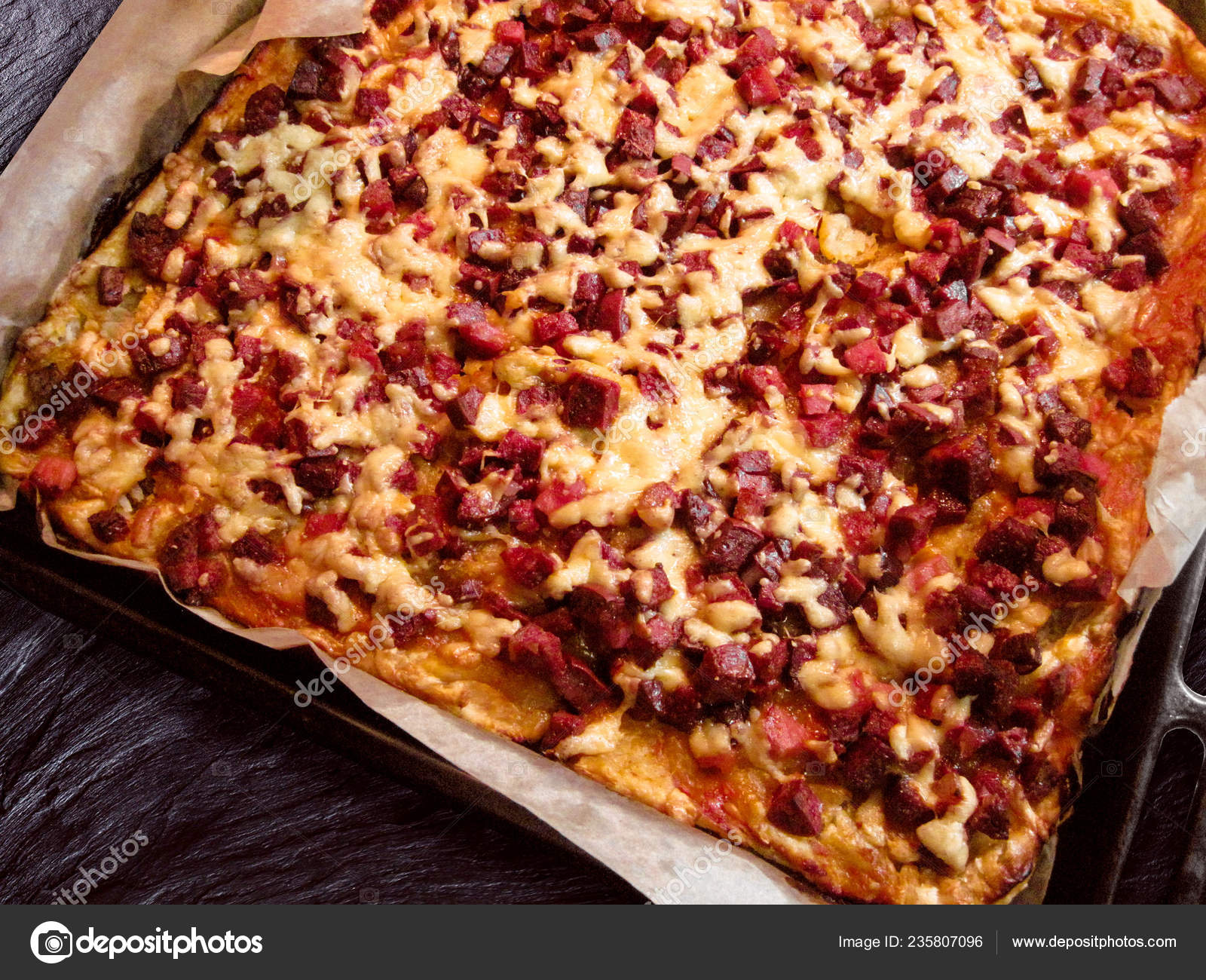Baked Pizza With Meat Sausages And Cheese Home Cooking Cuisine