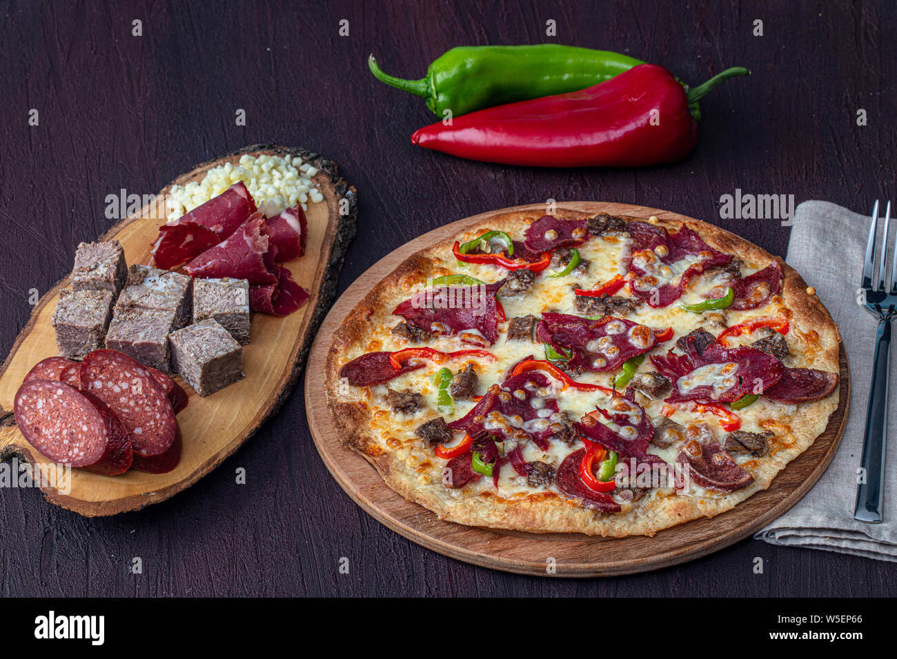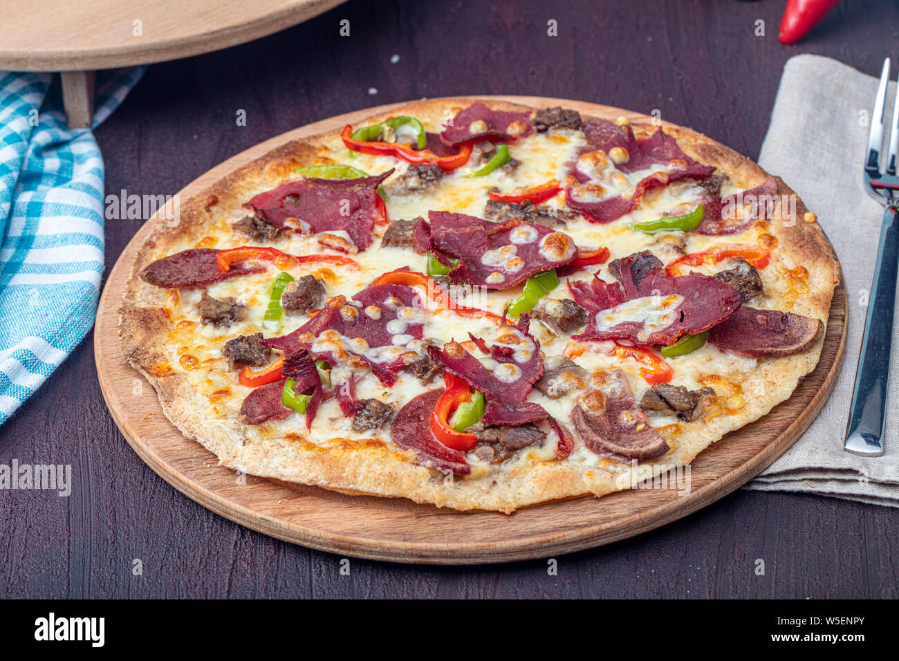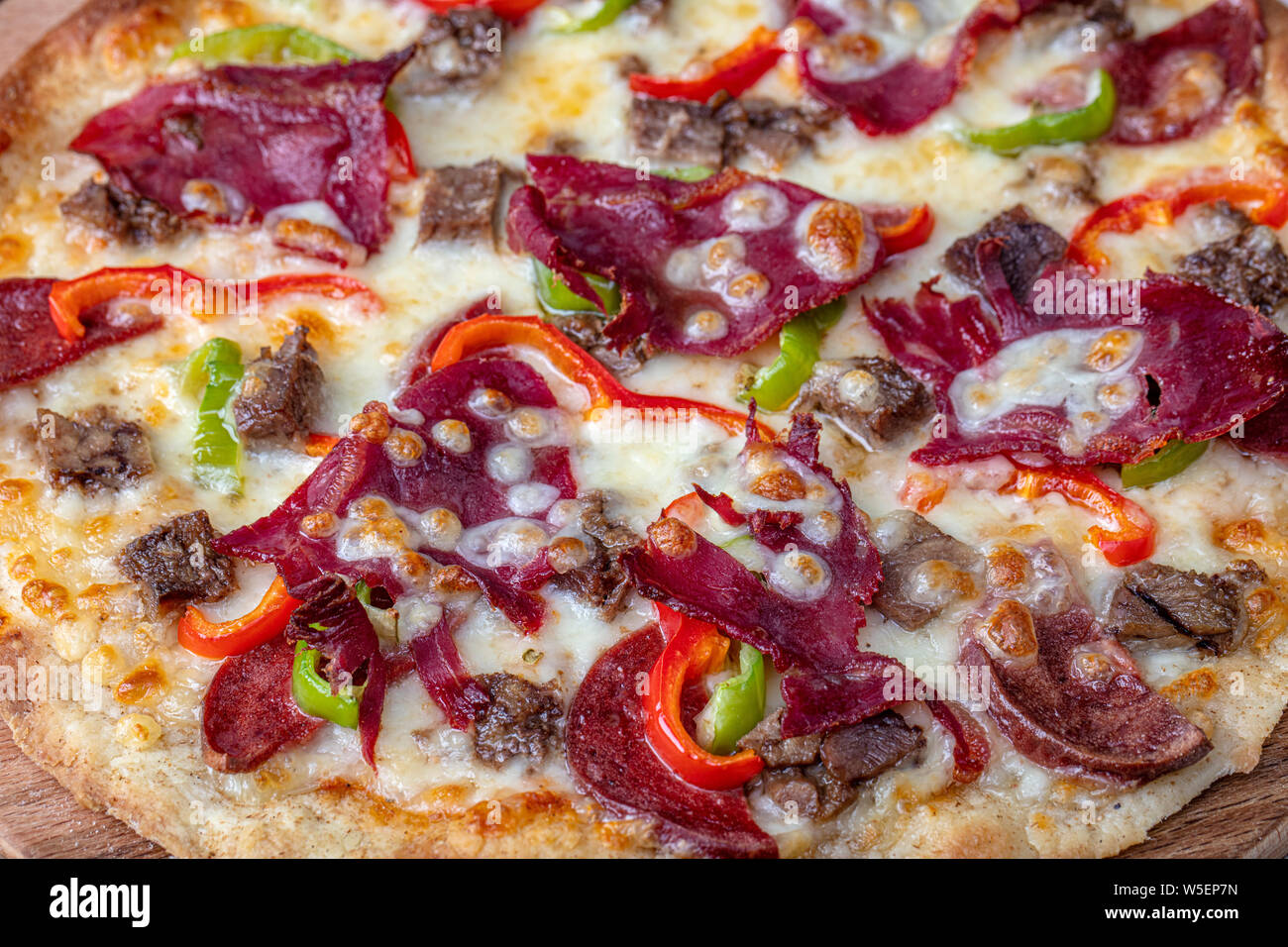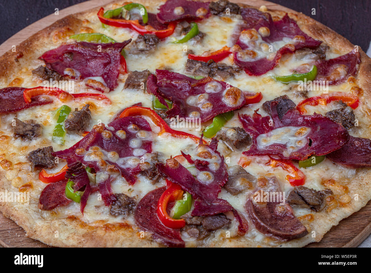 Baked Pizza With Meat Sausages And Cheese Home Cooking Cuisine