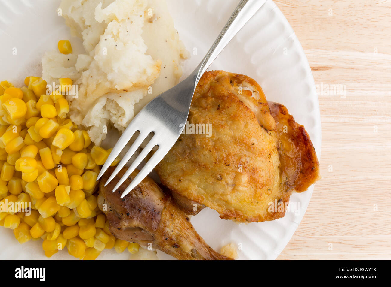 Top Close View Of Roasted Chicken Mashed Potatoes And Corn On A