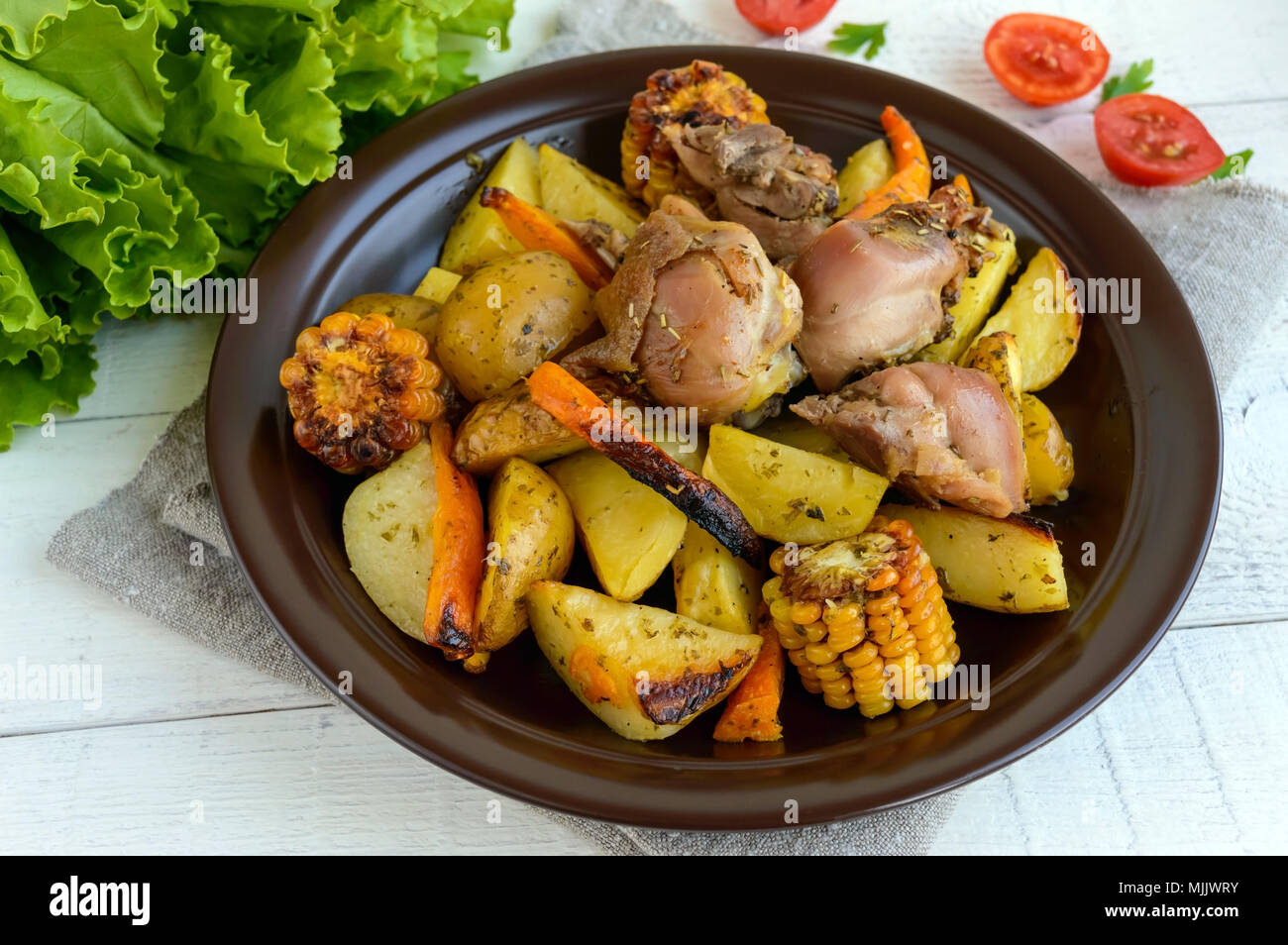 Closeup Baked Chicken Meat With Potatoes And Corn White Diet