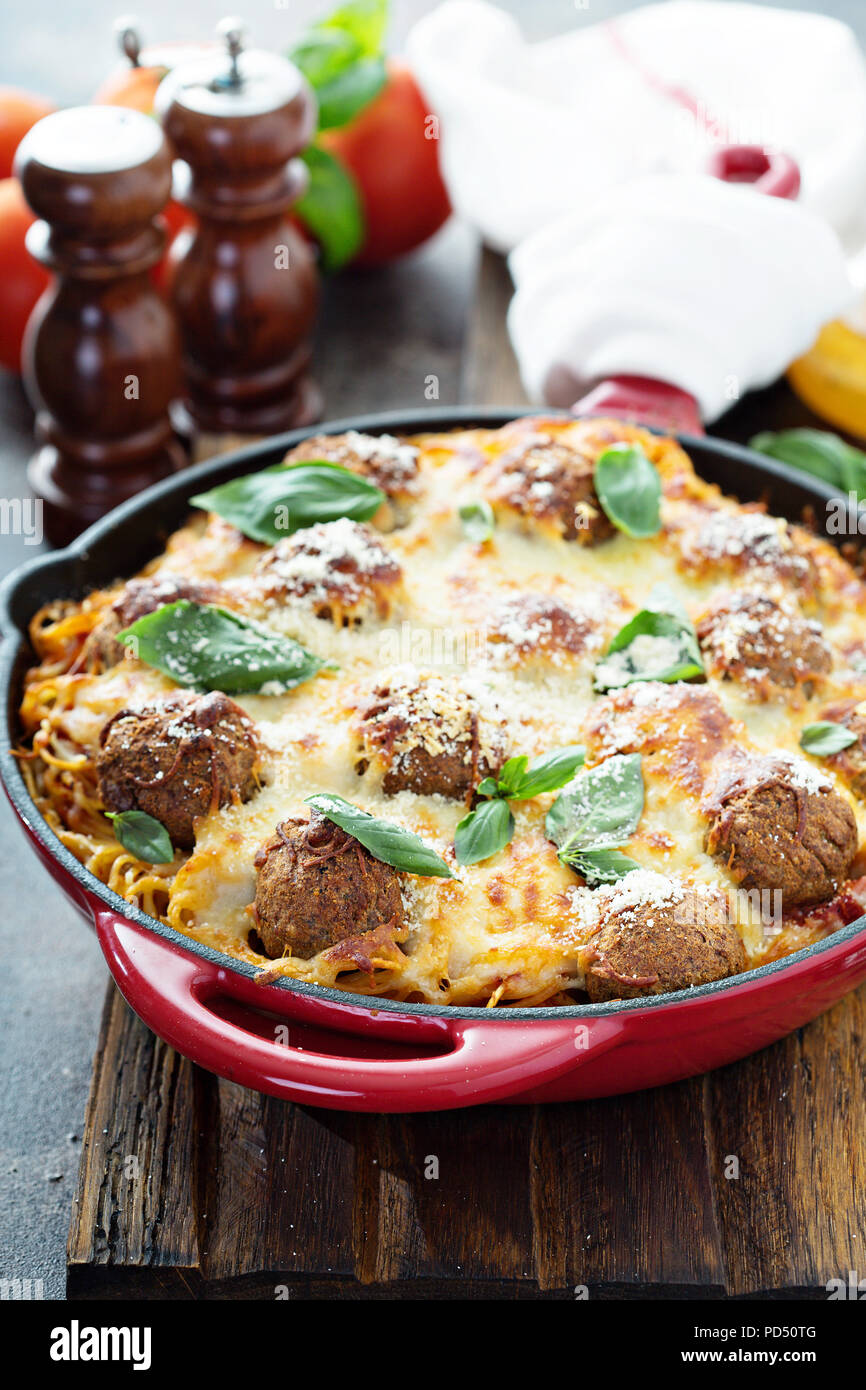 Baked Meatballs With Spaghetti Tomato Sauce Basil And Cheese