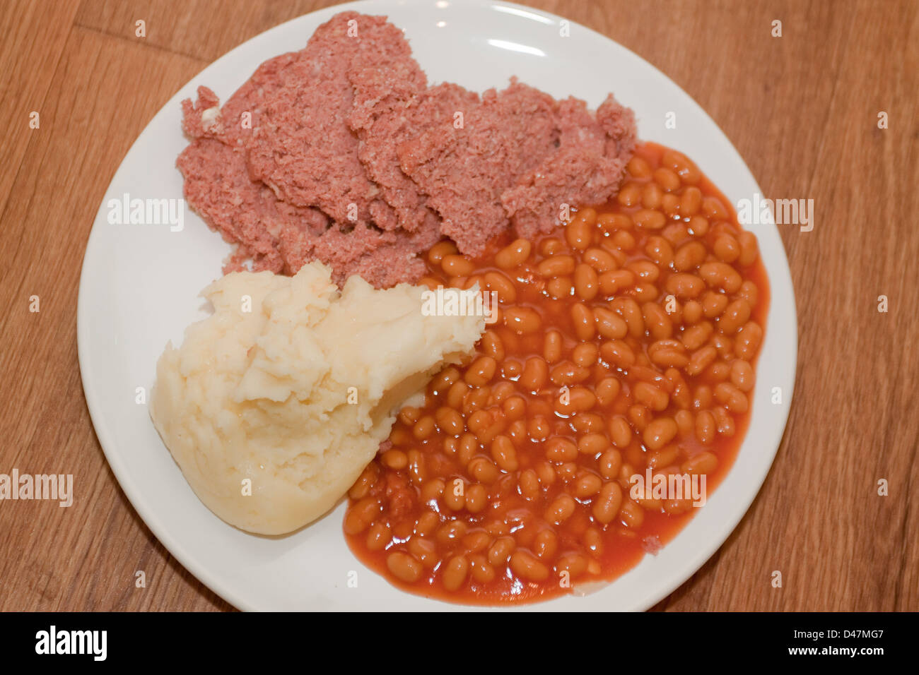 Corned Beef Baked Beans And Mashed Potato Meal On Plate Stock
