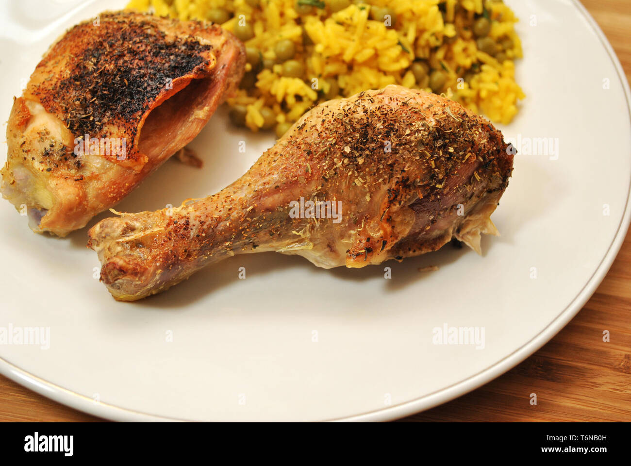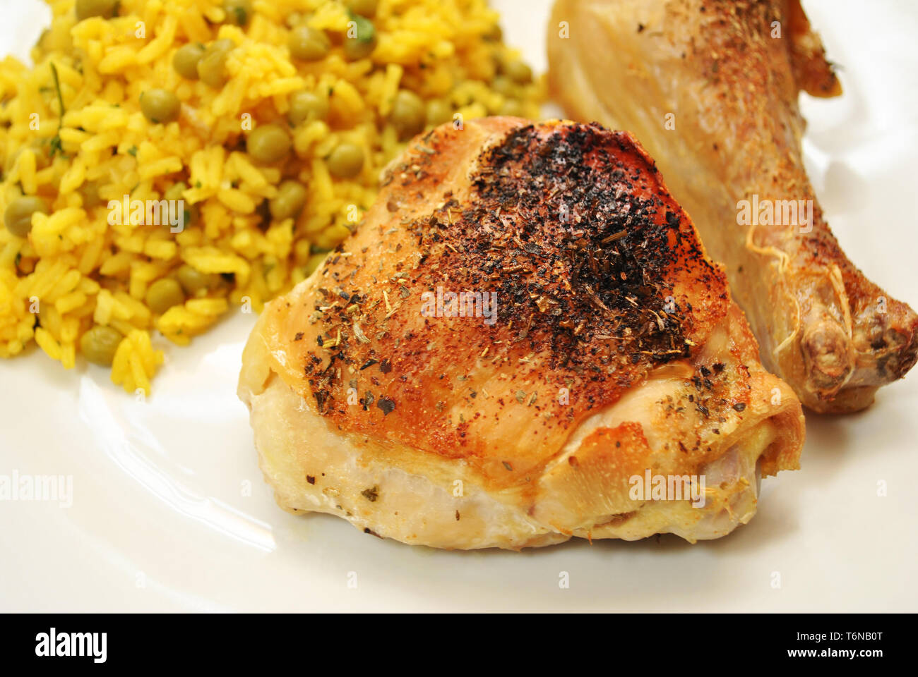 Crispy Baked Chicken Served With Rice Peas Stock Photo Alamy