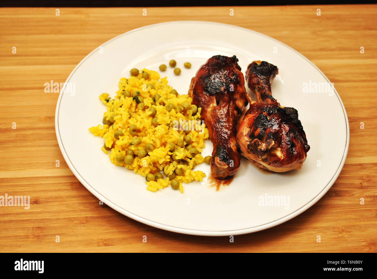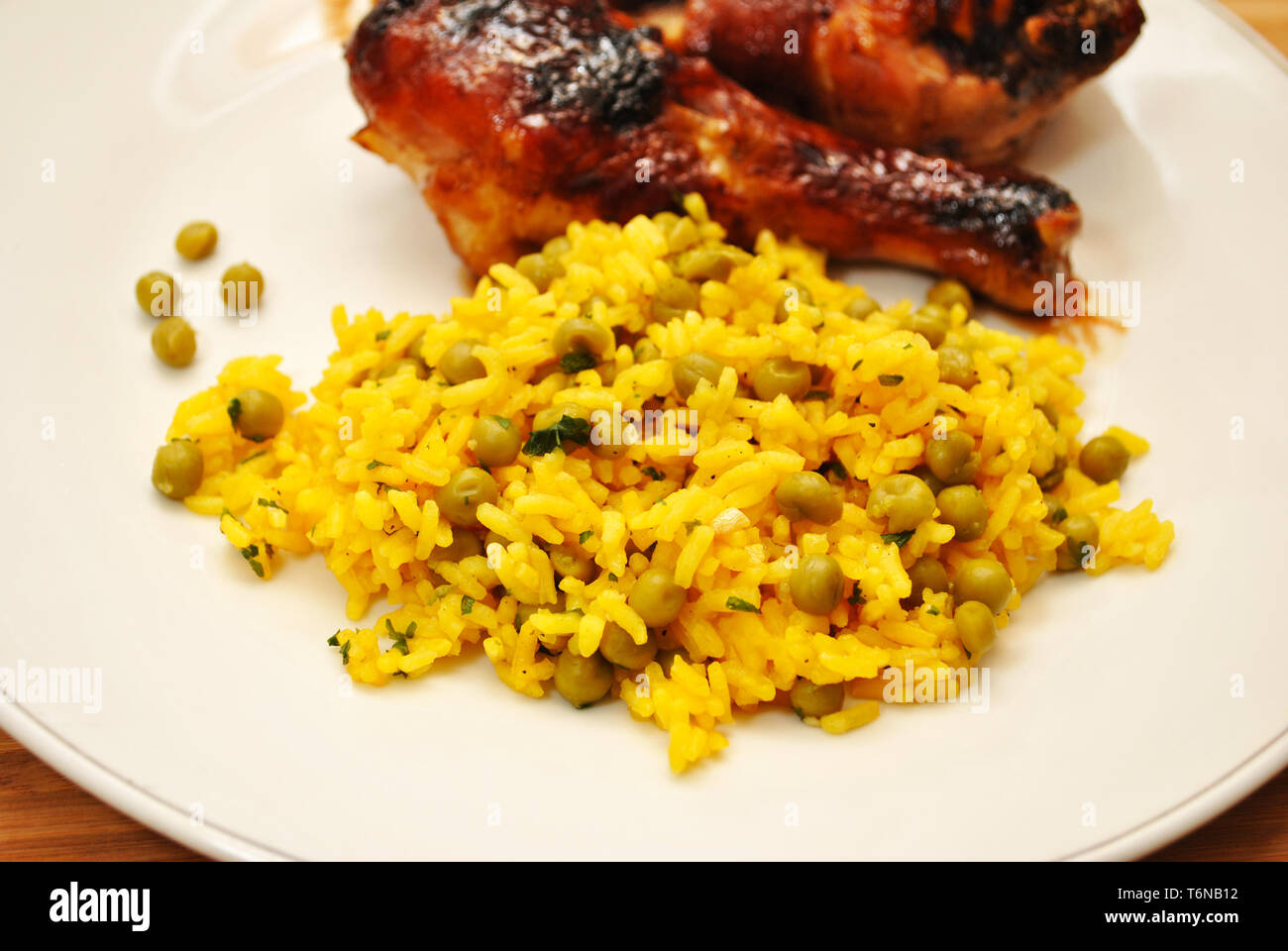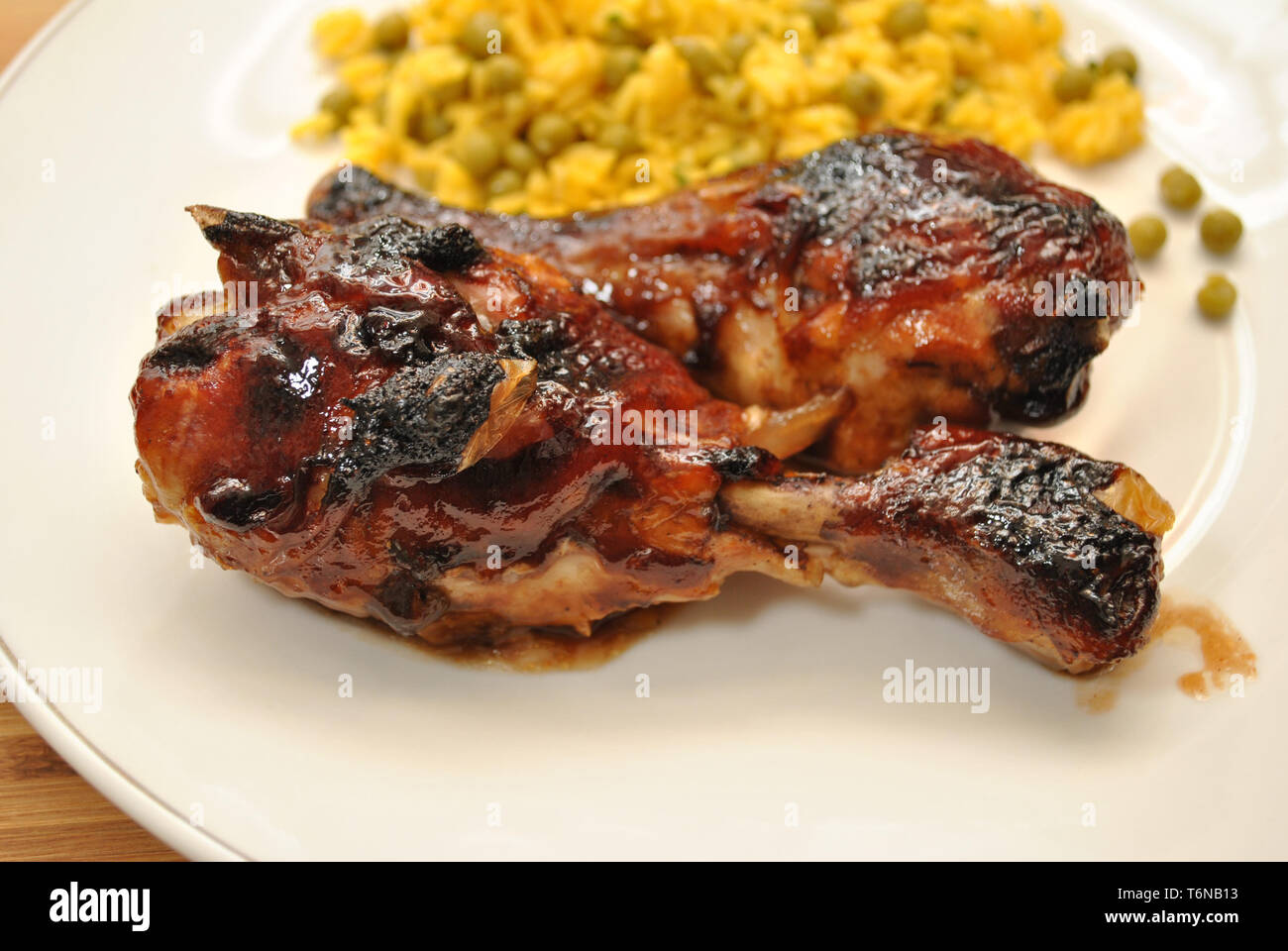 Rice Peas Served With Oven Baked Chicken With Bbq Sauce Stock