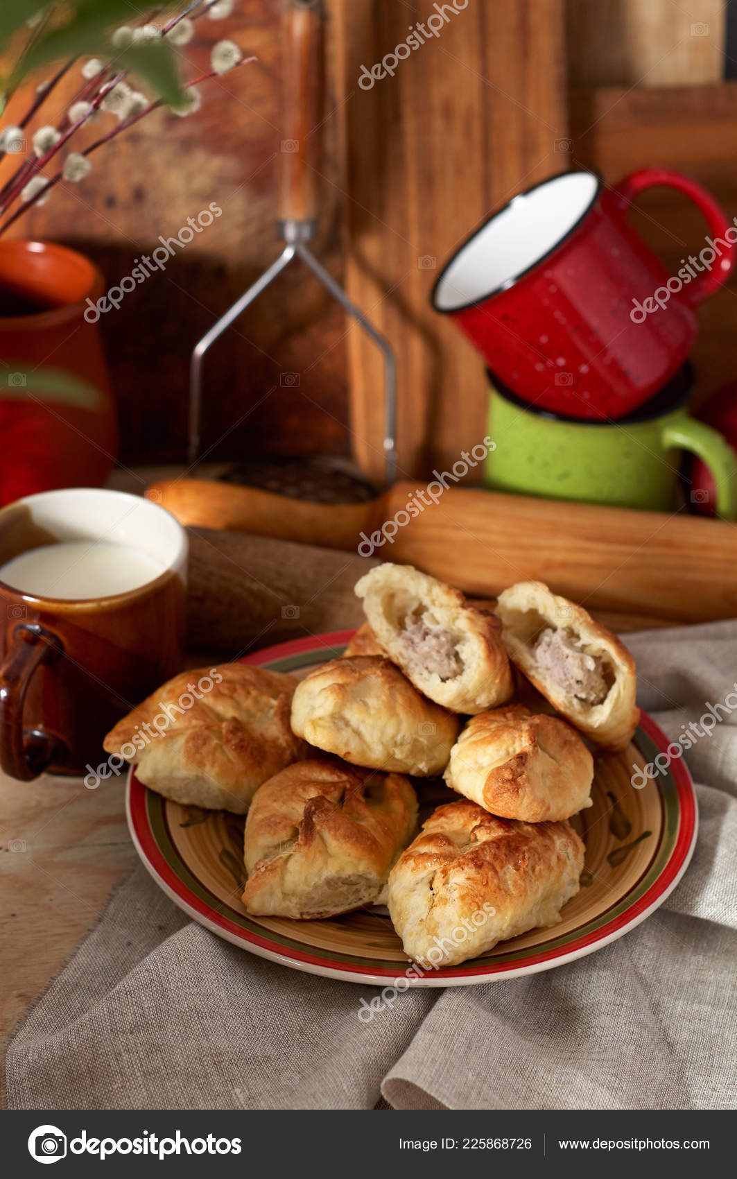 Russian Meat Piroshki Traditional Hand Mini Pies Wooden Background