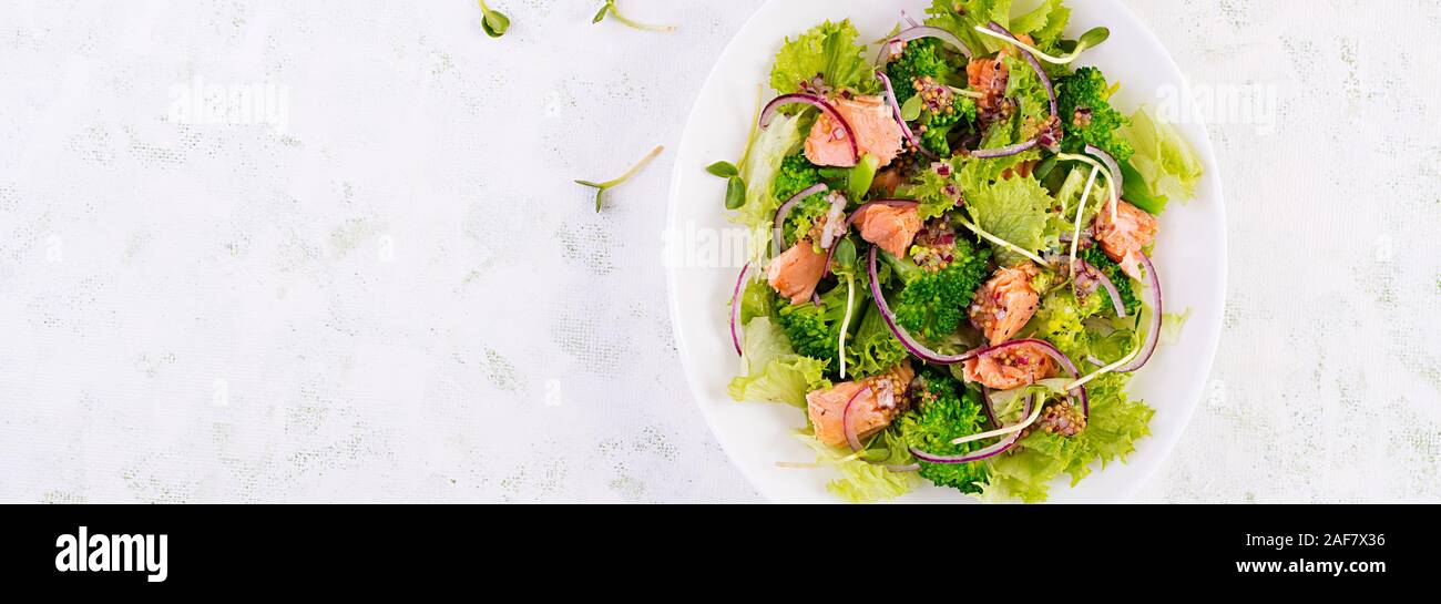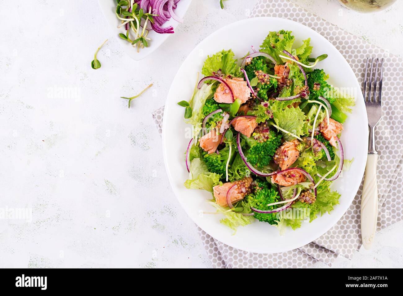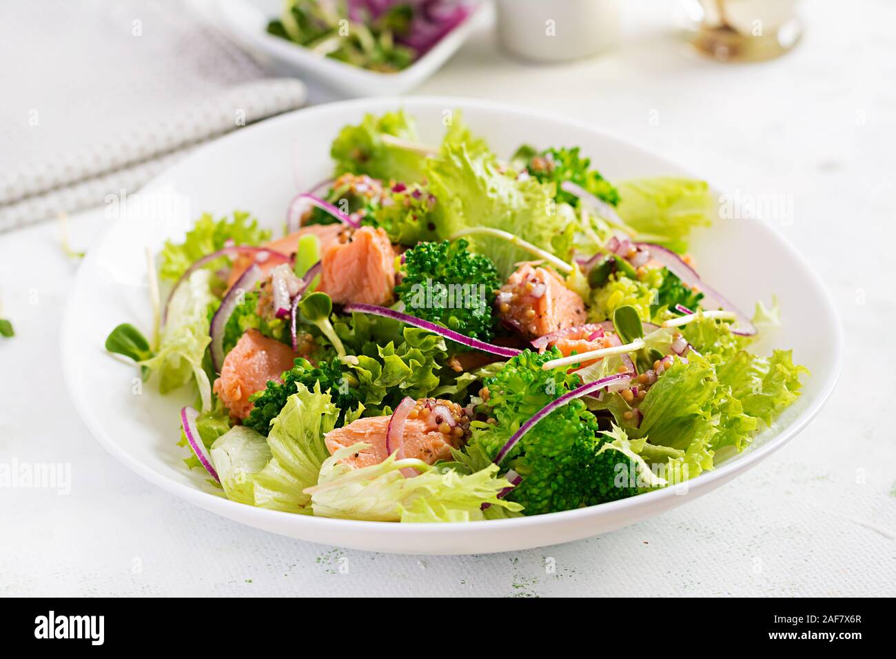 Salad Of Baked Fish Salmon Broccoli Lettuce Red Onion And