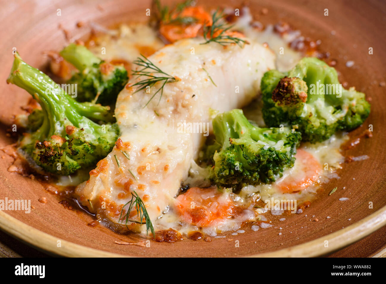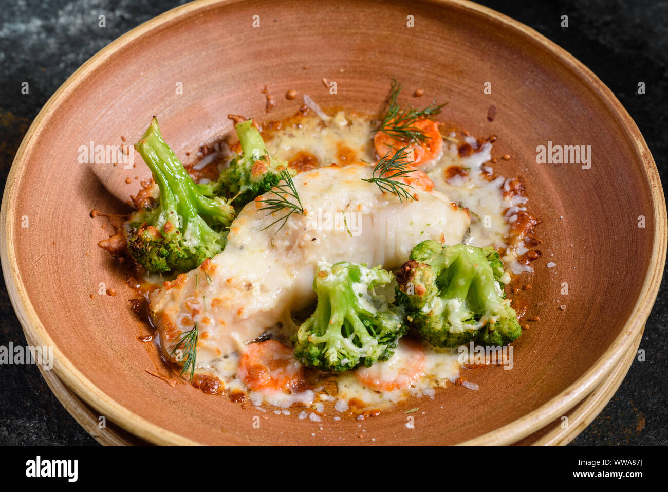 Fresh Baked Sea Fish With Broccoli Carrots Vegetables And Cheese