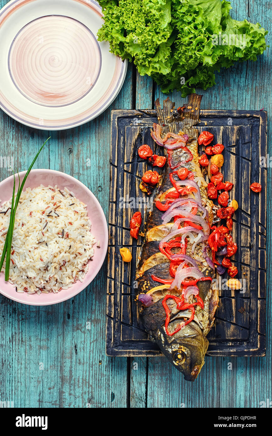 Baked Fish With Tomato Onion Stock Photo 209806490 Alamy
