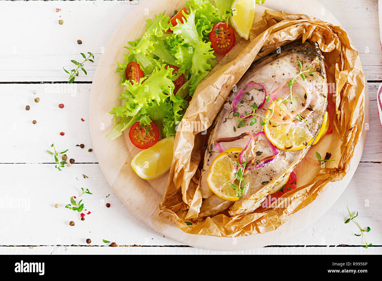 Fish Baked In Parchment Paper Stock Photo Image Of Diet Lemon
