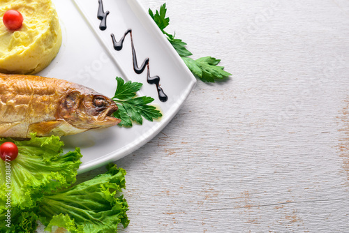 Baked Fish Sibas With Mashed Potatoes And Vegetables On A Wooden