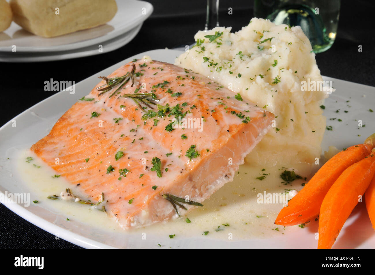 Herb Baked Salmon With Garlic Herbed Mashed Potatoes Glazed Baby