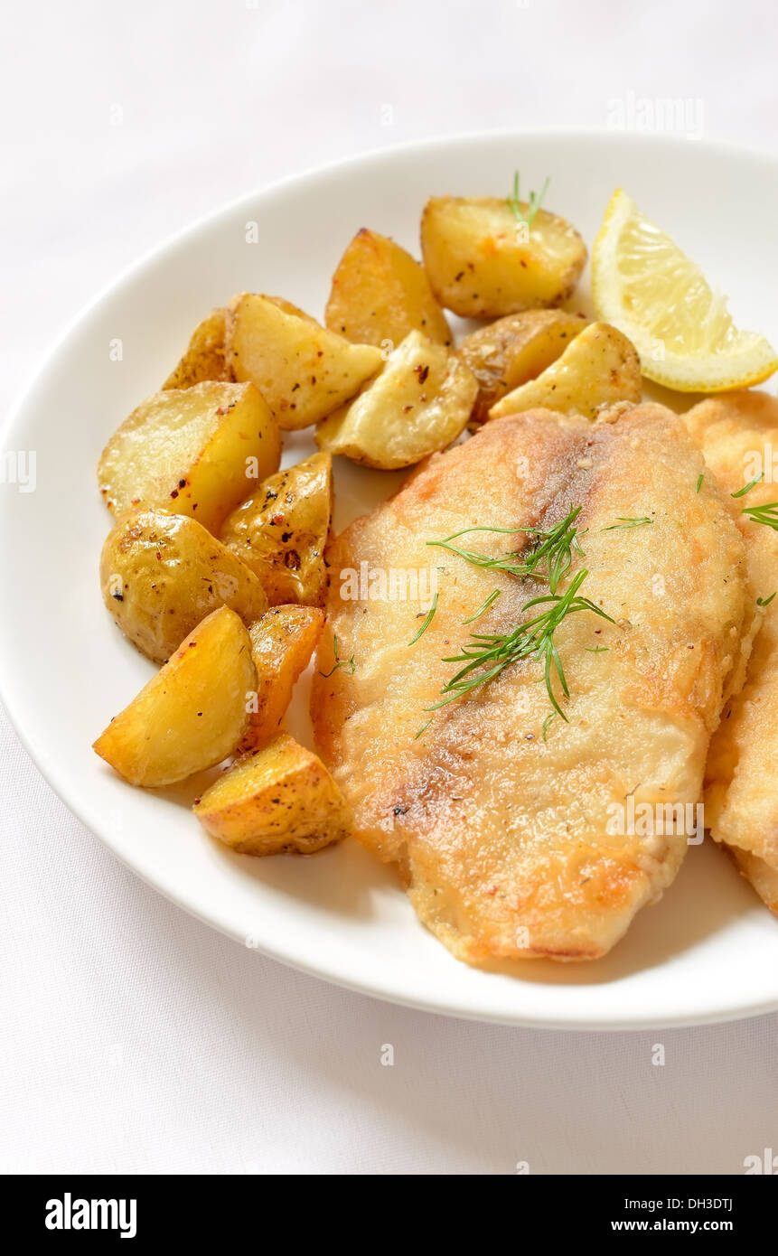 Fried Fish Fillet With Baked Potatoes On White Plate Stock Photo