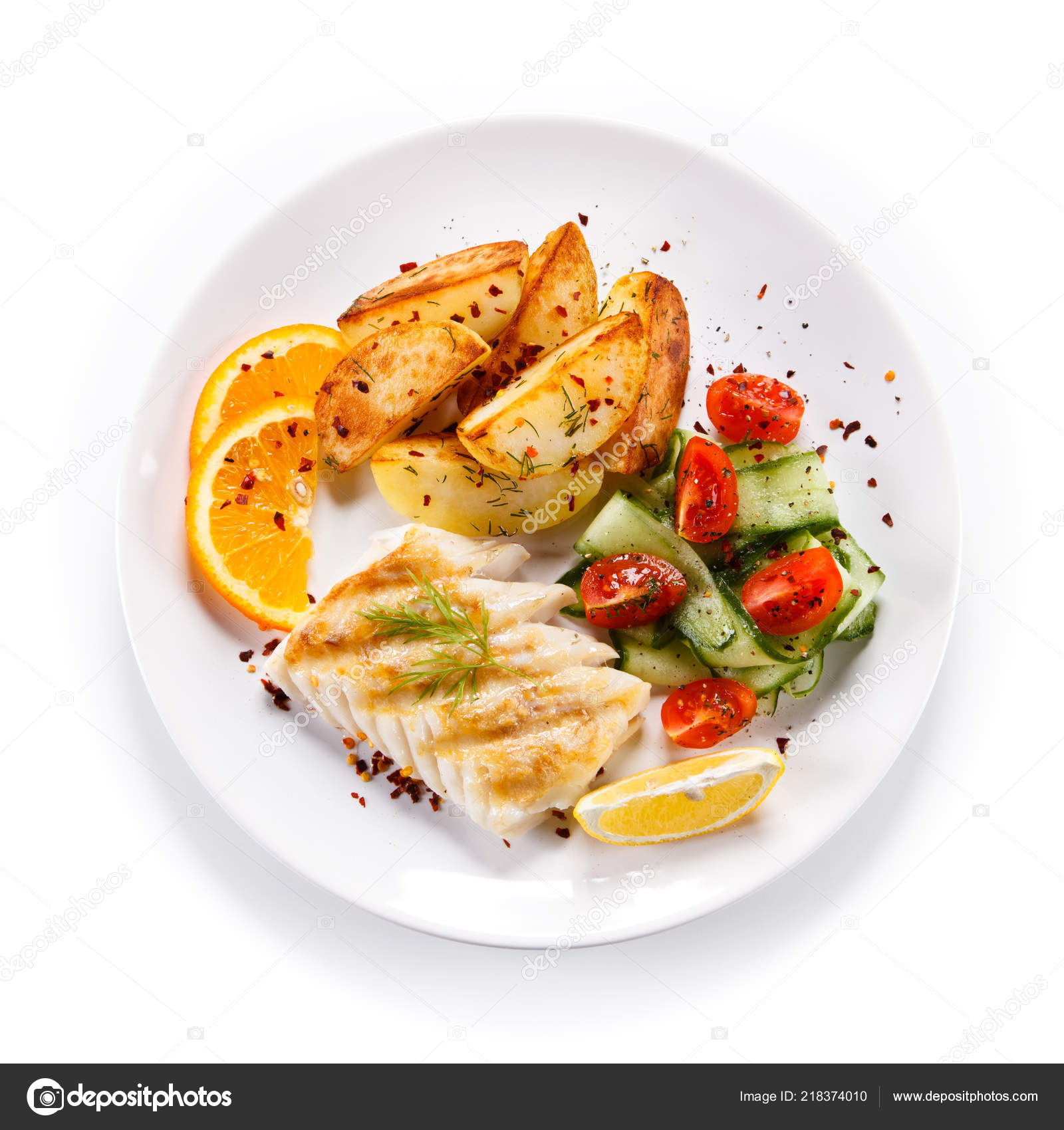 Fish Dish Fried Fish Fillet With Baked Potatoes And Vegetables
