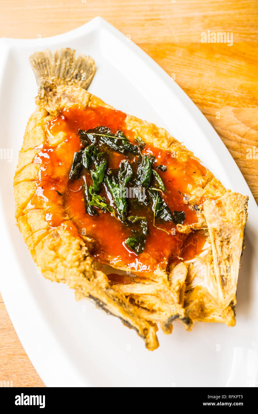 Fried Sea Bass Fish In White Plate With Spicy And Sweet Sauce In