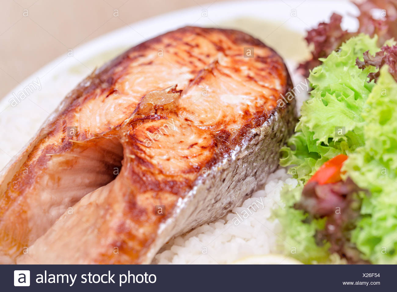 Tasty Grilled Salmon On White Plate With Green Lettuce Salad