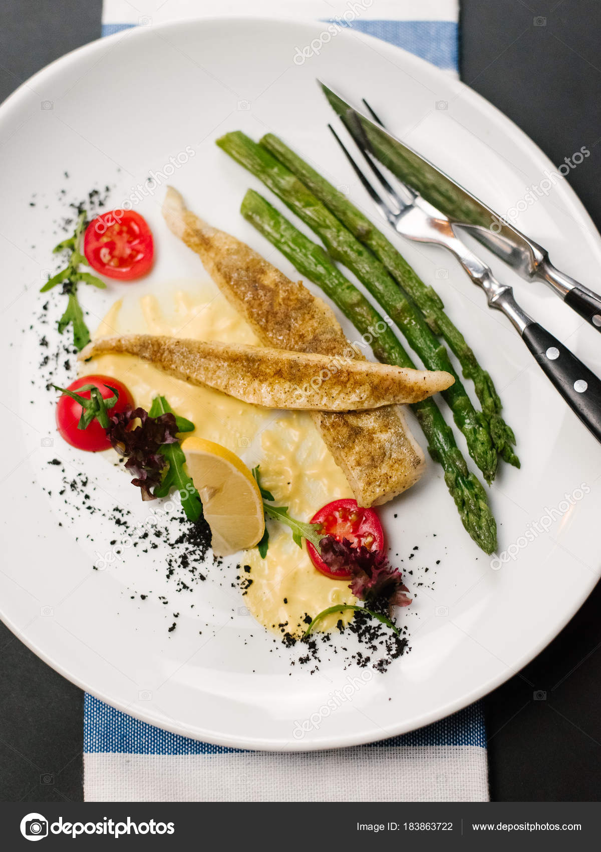 Appetizing Baked Fish Fillet Served Roasted Asparagus Cherry