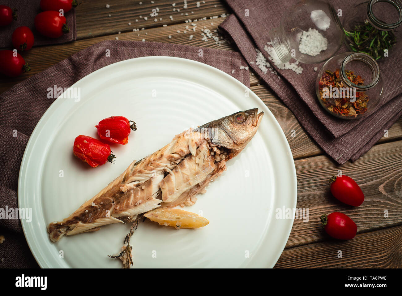 Close Up Of Oven Baked Fish On Plate Over Black Stone Background