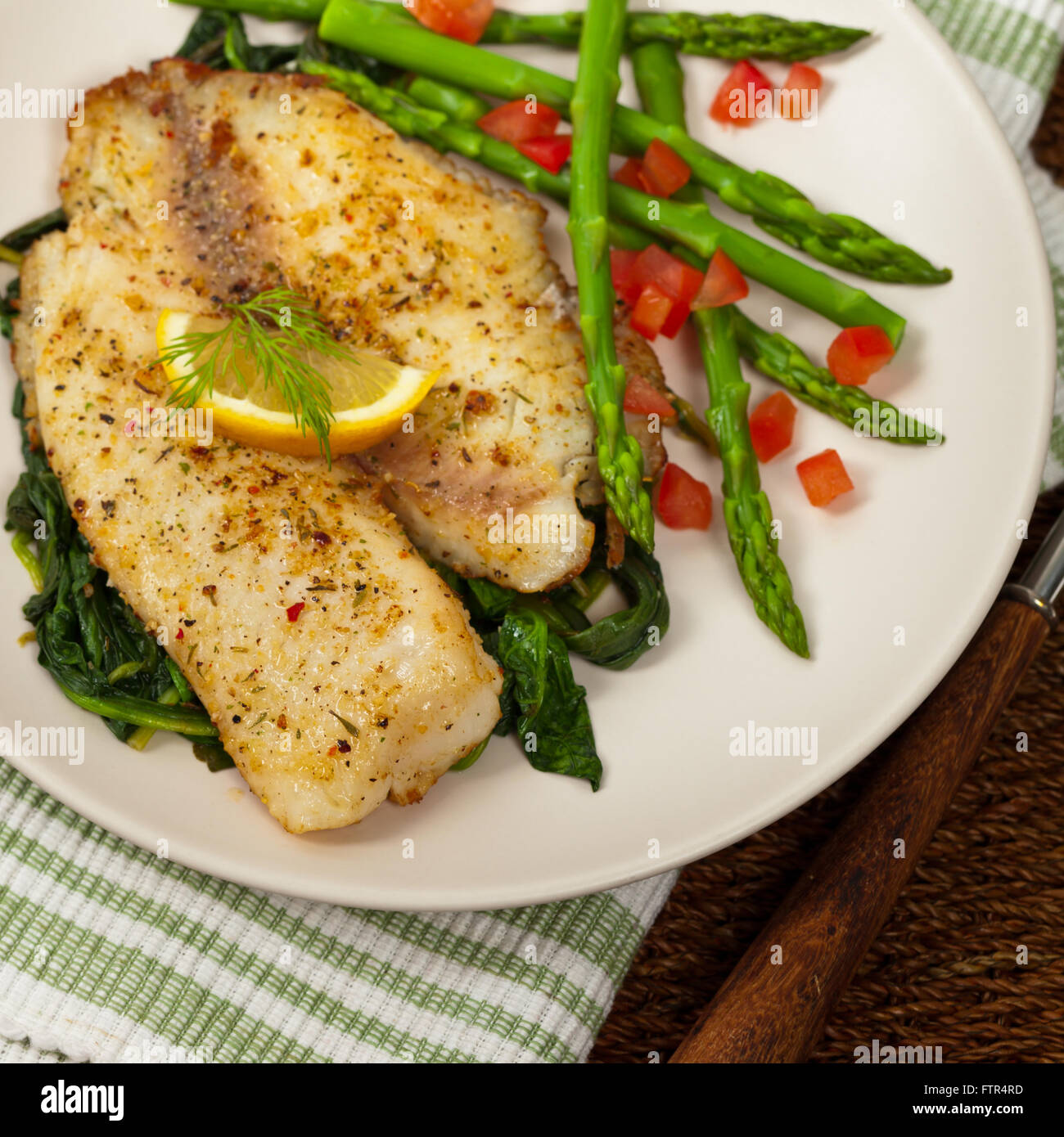 Baked Fish Fillet With Sauteed Spinach Stock Photo Alamy