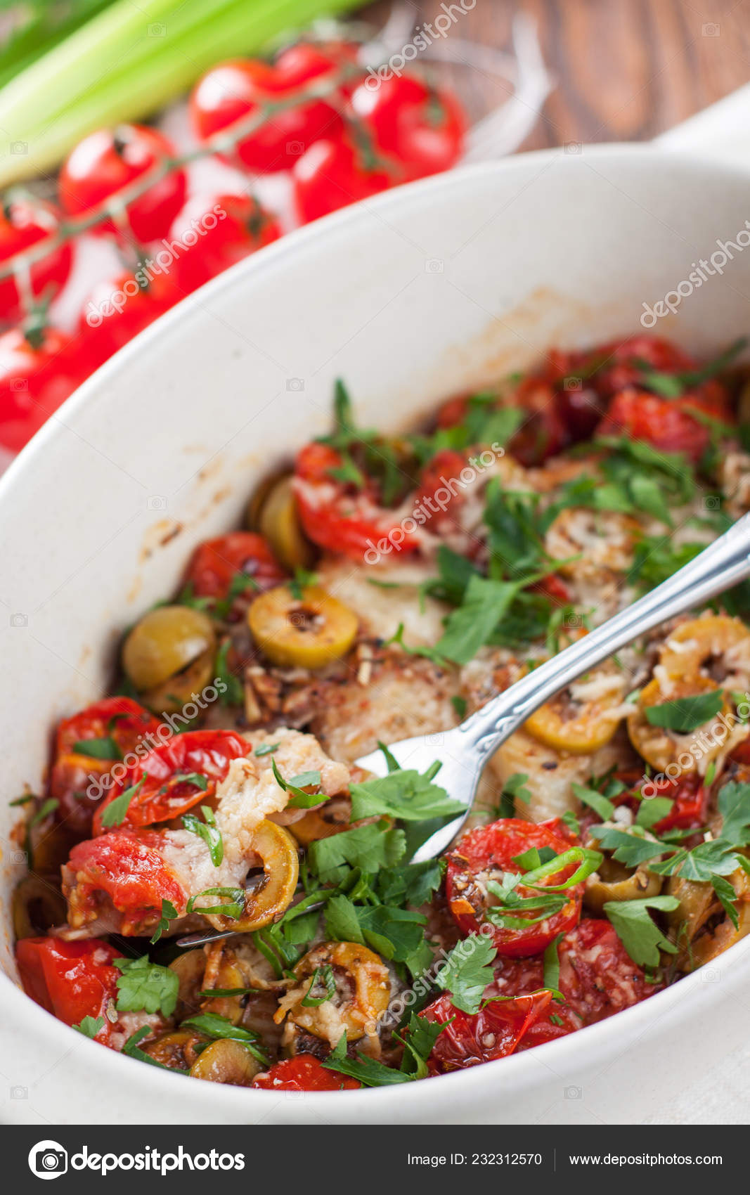 Mediterranean Style Baked Fish Vegetables Casserole Served Fresh