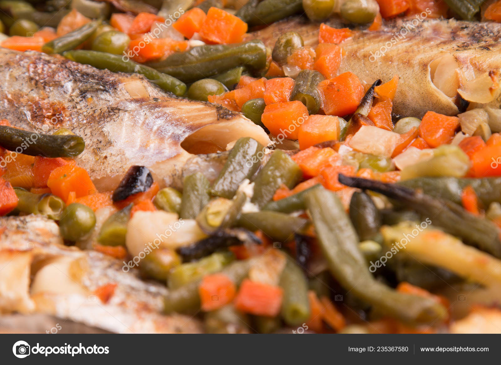Baked Fish Vegetables Close Mexican Mixture Baked Fish Stock Photo C Forton 235367580