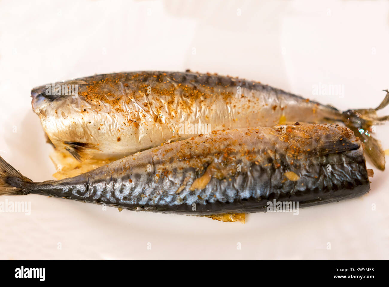 Two Baked Fish On A White Plate Mackerel Stock Photo 170868491